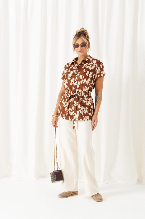 Стильный костюм состоит из жакета-блузки, топа и брюк, выполнен из мягкой ткани с волокнами льна и вискозы, практичен в носке.