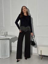 Юбка с фигурным разрезом по низу, который создает комфорт при движении. Пояс не широкий, притачной на эластичной резинке. Юбка декорирована металлическими пришивными элементами.