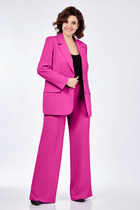 Комплект женский-двойка, из текстильной ткани, жакет удлиненный, полуприлегающего силуэта с центральной бортовой застежкой на пуговицы до линии перегиба лацкана. Спереди рельефные швы от плечевого шва, отрезной бочок и карман с клапаном. Спинка с рельефами от плечевого шва. Рукав втачной, двухшовный. Воротник пиджачного типа. Жакет на подкладке, длина по спинке 67 см, длина рукава 62 см. Брюки прямые,классические, с заутюженными стрелками,по переду обработаны карманы с отрезным бочком,застежка на тесьму-молнию и 1 пуговицу.На задних половинках обработаны вытачки и имитация карманов с листочкой, пояс в брюках притачной. Длина брюк от талии по боковому шву 100 см.
