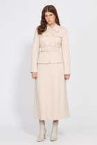 Комплект 2-х предметный состоит из жакета и и брюк. Жакет женский удлиненный,из трикотажной ткани, полуприлегающего силуэта с центральной бортовой застежкой на пуговицы до линии перегиба лацкана. Спереди рельефные швы от плечевого шва, отрезной бочок и карман с клапаном. Спинка с рельефами от плечевого шва. Рукав втачной, двухшовный. Воротник пиджачного типа. Перед жакета на подкладке, длина по спинке 67 см, длина рукава 62 см. Брюки классические,из текстильной ткани, прямые, слегка заужены к низу,заутюжены стрелки,по переду обработаны карманы с отрезным бочком,застежка на тесьму-молнию и 1 пуговицу.На задних половинках обработаны вытачки и имитация карманов с листочкой, пояс в брюках притачной. Длина брюк от талии по боковому шву 100 см.