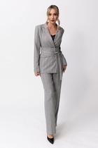 Комплект женский, 2-х предметный, состоит из жакета и и брюк. Жакет женский удлиненный, из текстильной ткани, на подкладке, полуприлегающего силуэта с центральной бортовой застежкой на пуговицы до линии перегиба лацкана. Спереди рельефные швы от плечевого шва, отрезной бочок и карман с клапаном. Спинка с рельефами от плечевого шва. Рукав втачной, двухшовный. Воротник пиджачного типа. Длина по спинке 66 см, длина рукава 62 см.Брюки прямые,классические, с заутюженными стрелками,по переду обработаны карманы с отрезным бочком,застежка на тесьму-молнию и 1 пуговицу.На задних половинках обработаны вытачки и имитация карманов с листочкой, пояс в брюках притачной. Длина брюк от талии по боковому шву 105 см.