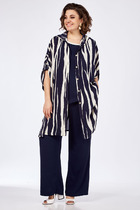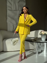 Комплект женский, 2-х предметный, состоит из жакета и и брюк. Жакет женский удлиненный, из текстильной ткани, на подкладке, полуприлегающего силуэта с центральной бортовой застежкой на пуговицы до линии перегиба лацкана. Спереди рельефные швы от плечевого шва, отрезной бочок и карман с клапаном. Спинка с рельефами от плечевого шва. Рукав втачной, двухшовный, по низу рукава обработана шлица на петли-пуговицы. Воротник пиджачного типа. Длина по спинке 66 см, длина рукава 62 см.Брюки прямые,классические, с заутюженными стрелками,по переду обработаны карманы с отрезным бочком,застежка на тесьму-молнию и 1 пуговицу.На задних половинках обработаны вытачки и имитация карманов с листочкой, пояс в брюках притачной. Длина брюк от талии по боковому шву 100 см.