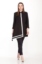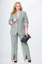 Комплект женский, 2-х предметный, состоит из жакета и и брюк. Жакет женский удлиненный, из текстильной ткани, на подкладке, полуприлегающего силуэта с центральной бортовой застежкой на пуговицы до линии перегиба лацкана. Спереди рельефные швы от плечевого шва, отрезной бочок и карман с клапаном. Спинка с рельефами от плечевого шва. Рукав втачной, двухшовный, по низу рукава обработана шлица на петли-пуговицы. Воротник пиджачного типа. Длина по спинке 66 см, длина рукава 62 см.Брюки прямые,классические, с заутюженными стрелками,по переду обработаны карманы с отрезным бочком,застежка на тесьму-молнию и 1 пуговицу.На задних половинках обработаны вытачки и имитация карманов с листочкой, пояс в брюках притачной. Длина брюк от талии по боковому шву 100 см.