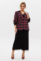 Комплект женский, 2-х предметный, из текстильной ткани, состоит из жакета и юбки. Жакет женский удлиненный, на подкладке, полуприлегающего силуэта с центральной бортовой застежкой на пуговицы до линии перегиба лацкана. Спереди рельефные швы от плечевого шва, отрезной бочок и карман с клапаном. Спинка с рельефами от плечевого шва. Рукав втачной, двухшовный, по низу рукава обработана шлица на петли-пуговицы. Воротник пиджачного типа. Длина по спинке 66 см, длина рукава 62 см. Юбка прямого силуэта, с фигурной кокеткой по переду и разрезом-шлицей. Заднее полотнище со средним швом, в котором обработана застежка потайная. Верх юбки обработан обтачками. Длина по боковому шву 64 см. Юбка на подкладке.