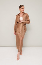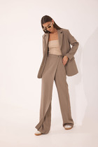 Комплект женский-двойка, из текстильной ткани, жакет удлиненный, полуприлегающего силуэта с центральной бортовой застежкой на пуговицы до линии перегиба лацкана. Спереди рельефные швы от плечевого шва, отрезной бочок и карман с клапаном. Спинка с рельефами от плечевого шва. Рукав втачной, двухшовный. Воротник пиджачного типа. Жакет на подкладке, длина по спинке 67 см, длина рукава 62 см. Брюки прямые, классические, с заутюженными стрелками, по переду обработаны карманы с отрезным бочком, застежка на тесьму-молнию и 1 пуговицу. На задних половинках обработаны вытачки и имитация карманов с листочкой, пояс в брюках притачной, по боковому на резинке.  Длина брюк от талии по боковому шву 103 см.