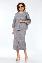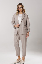 Комплект женский-двойка, из текстильной ткани, жакет удлиненный, полуприлегающего силуэта с центральной бортовой застежкой на пуговицы до линии перегиба лацкана. Спереди рельефные швы от плечевого шва, отрезной бочок и карман с клапаном. Спинка с рельефами от плечевого шва. Рукав втачной, двухшовный. Воротник пиджачного типа. Жакет на подкладке, длина по спинке 67 см, длина рукава 62 см. Брюки прямые, классические, с заутюженными стрелками, по переду обработаны карманы с отрезным бочком, застежка на тесьму-молнию и 1 пуговицу. На задних половинках обработаны вытачки и имитация карманов с листочкой, пояс в брюках притачной. Длина брюк от талии по боковому шву 103 см.