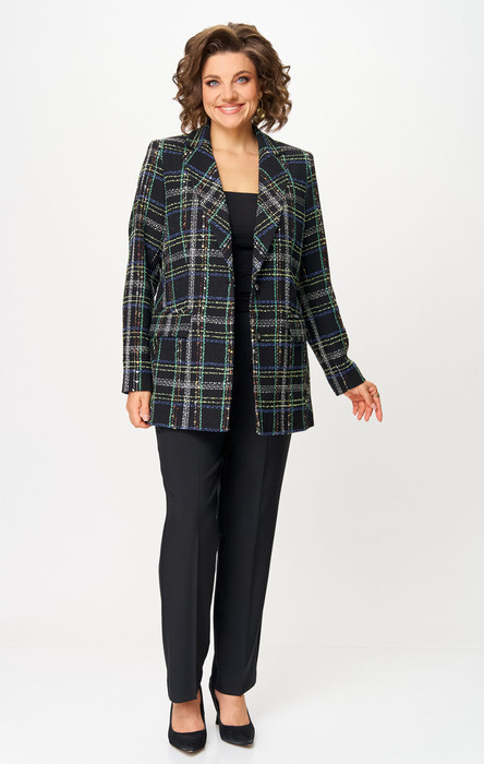 Комплект женский-двойка,из костюмной ткани, жакет удлиненный, свободного силуэта с центральной бортовой застежкой на пуговицы до линии перегиба лацкана. По переду имеется отрезной бочок и вертикальные вытачки. С прорезными карманами с клапаном и двумя обтачками. Спинка цельная. Воротник пиджачного типа. Рукав двухшовный, втачной. Жакет на подкладке. Длина рукава 63 см, длина по спинке 75 см. Брюки прямые, классические, из текстильной ткани, с заутюженными стрелками, по переду обработаны карманы с отрезным бочком, застежка на тесьму-молнию и 1 пуговицу. На задних половинках обработаны вытачки и имитация карманов с листочкой, пояс в брюках притачной. Длина брюк от талии по боковому шву 103 см.