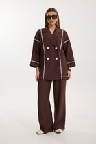 Костюм женский, 2-х предметный, состоит из жакета и  брюк. Выполнен из хлопковой ткани. Жакет женский удлиненный, силуэт свободный, с центральной бортовой застежкой на пуговицы до линии перегиба лацкана. Спереди отрезной бочок и карман с клапаном. Спинка цельная. Рукав втачной. Воротник пиджачного типа. Перед жакета на подкладке. Длина по спинке 75 см, длина брюк по боковому 102 см.