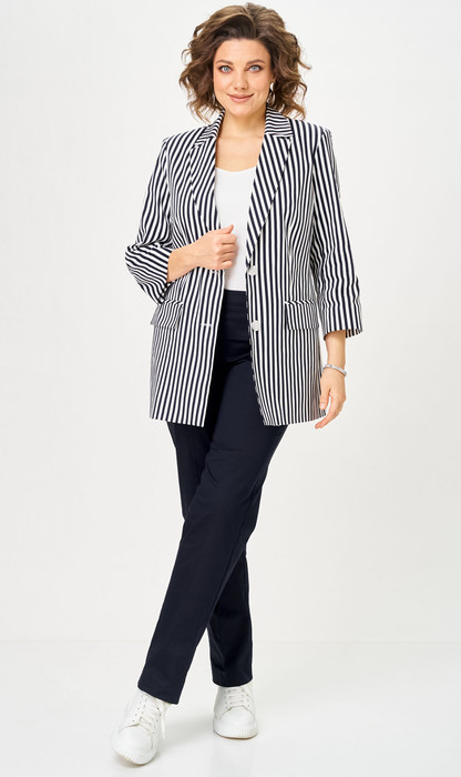Костюм женский, 2-х предметный, состоит из жакета и брюк. Выполнен из хлопковой ткани. Жакет женский удлиненный, силуэт свободный, с центральной бортовой застежкой на пуговицы до линии перегиба лацкана. Спереди отрезной бочок и карман с клапаном. Спинка цельная. Рукав втачной. Воротник пиджачного типа. Перед жакета на подкладке. Длина по спинке 75 см, длина брюк по боковому 102 см.