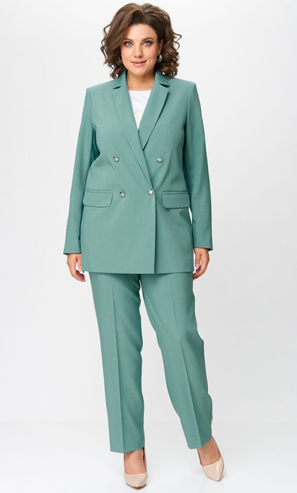Комплект 2-х предметный состоит из жакета и и брюк. Двубортный жакет, свободного кроя, на подкладке. По переду имеется отрезной бочок и вертикальные вытачки. С прорезными карманами с клапаном и двумя обтачками. Спинка цельная. Воротник пиджачного типа. Рукав двухшовный, по низу рукава обработана шлица на петли-пуговицы. Длина рукава 63 см, длина по спинке 74 см.  Брюки прямые, классические, с заутюженными стрелками, по переду обработаны карманы с отрезным бочком, застежка на тесьму-молнию и 1 пуговицу. На задних половинках обработаны вытачки и имитация карманов с листочкой, пояс в брюках притачной, по боковому на резинке.  Длина брюк от талии по боковому шву 103 см.