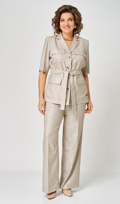 Комплект 2-х предметный состоит из жакета и и брюк. Стильный льняной жакет, без подкладки, прямого кроя, с центральной застежкой на петли-пуговицы. Дополнен накладными карманами с клапаном. Спинка со средним швом. Притален съемным поясом из ткани верха. Рукав втачной,короткий.  Брюки-палаццо, средней ширины, выполнены с карманами с отрезным бочком в боковом шве. Пояс притачной, застёжка на молнию. По задним половинкам обработаны вытачки, и в области боковых вставлена резинка. Длина жакета по спинке 69 см, длина брюк по боковому 105 см.
