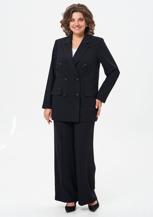 Женский комплект 2-х предметный, праздничный, состоит из жакета и брюк из текстильной ткани. Жакет двубортный, свободного кроя, на подкладке. По переду имеется отрезной бочок и вертикальные вытачки. С прорезными карманами с клапаном и двумя обтачками. Спинка со средним швом. Воротник пиджачного типа. Рукав двухшовный, втачной. Длина рукава 63 см, длина по спинке 74 см. Брюки-палаццо,средней ширины, выполнены с карманами с отрезным бочком в боковом шве. Пояс притачной, застёжка на молнию. По задним половинкам обработаны вытачки. Длина по боковому шву 108 см.