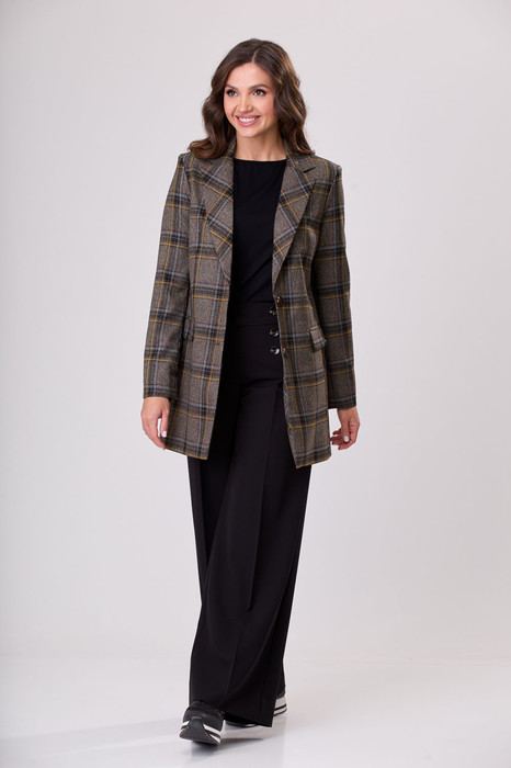 Комплект 2-х предметный состоит из жакета и и брюк. Жакет женский удлиненный, из текстильной ткани, полуприлегающего силуэта с центральной бортовой застежкой на пуговицы до линии перегиба лацкана. По переду имеется отрезной бочок и вертикальные вытачки. С прорезными карманами с клапаном и двумя обтачками. Спинка со средним швом. Воротник пиджачного типа. Рукав двухшовный, втачной. Длина рукава 63 см, длина по спинке 80 см. Брюки-палаццо из текстильной ткани. В брюках выполнены карманы с отрезным бочком в боковом шве, одна складка в районе пояса. Пояс притачной, с отделочным удлиненным поясом из текстильной ткани. Застёжка на молнию. По задним половинкам обработаны вытачки. Длина по боковому шву 105 см.