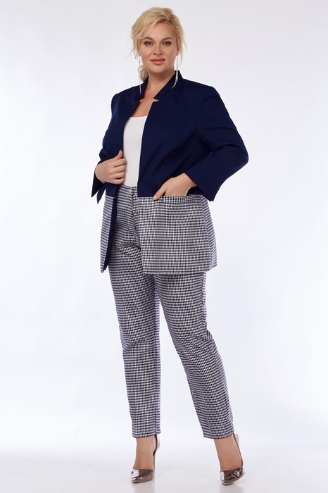 Костюм женский двухпредметный,состоит из жакета и брюк. Жакет полуприлегающего силуэта, на подкладке. Полочка и спинка с декоративным подрезом , двухцветный. На нижней части полочки обработан карман листочка, рукав втачной 3/4 с разрезом по локтевому шву, застежка на крючок. Брюки полуприлегающего силуэта,с карманом в боковом шве,с высокой посадкой,застежка на молнию и пуговицу.