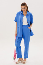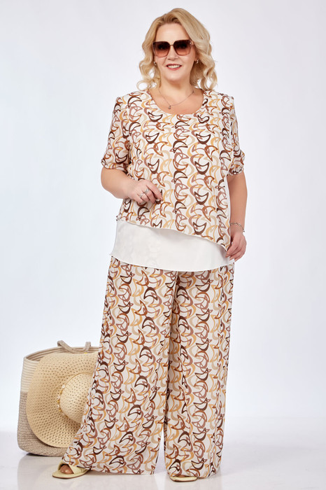 Костюм женский двухпредметный, свободного силуэта, состоит из шифоновой блузки и брюк. Блузка двухцветная с отлитной детальюпо переду и спинке, рукав втачной. Брюки на подкладке, пояс на резинке, в боковых швах карманы.