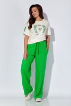 Костюм женский полуприлегающего силуэта, состоит из джемпера и брюк. Джемпер с подрезом по центру переда, с декоративным украшением, рукав втачной 3/4 с резинкой по низу, в боковых швах разрезы. Брюки с застежкой на молнию и пуговицу, в боковых швах карманы.