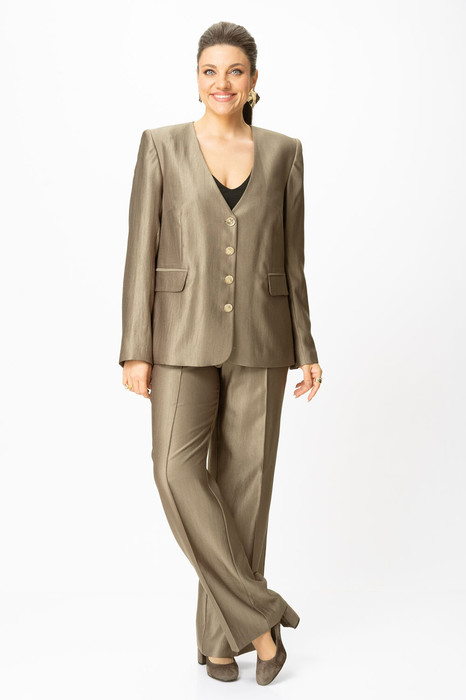 Жакет полуприлегающего силуэта, по переду прорезные карманы с клапаном. Горловина «V» образная, застежка центральная на петли-пуговицы. По спинке в центральном шве отлетная шлица по низу. Рукава втачные, по низу отлетная шлица с декором из пуговиц. Жакет на подкладке.