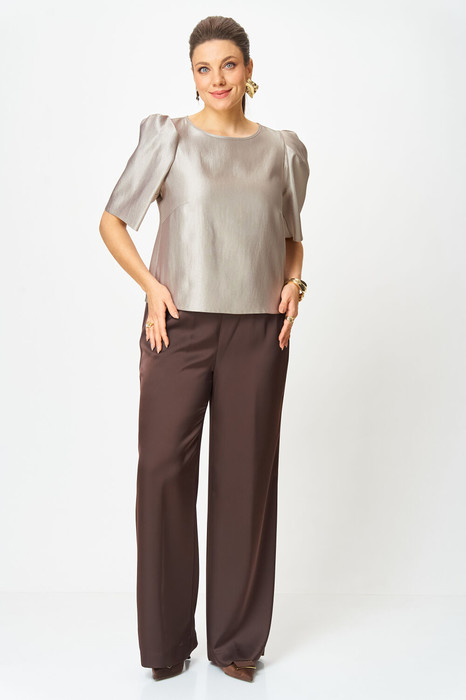 Брюки свободного силуэта, прямые к низу, выполнены из атласной ткани, брюки без застежки, верх брюк на поясе с резинкой.