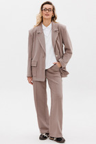 Жакет полуприлегающего силуэта, с центральной застежкой на одну пуговицу, борт с отворотом лацкана и воротником пиджачного типа. По переду накладные карманы с клапаном, рукава втачные с подрезом по линии локтя и патой для подхвата рукава на пуговицы. Жакет без подкладки. Все отделочные строчки на костюме выполнены контрастными нитками.