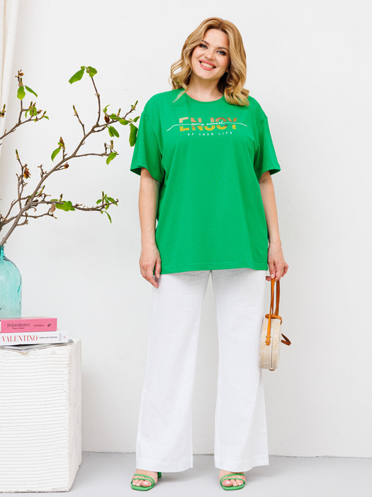 Комплект женский состоит из футболки и брюк на резинке. Базовая женская футболка. Крой футболки свободный, оверсайз.Вырез горловины круглый. Рукав до локтя. Линия плеча спущенная.Футболка выполнена из хлопкового трикотажного полотна.Трикотаж не просвечивается, не деформируется после стирки, легко гладится.По переду выполнена авторская печать в виде надписи “enjoy” переливающейся фольгой. Длина - 70 см Льняные брюки свободного кроя. Пояс на резинке, для удобства в носке в пояс вставлен шнурок для регулирования обьема по талии. Посадка брюк - высокая. По переду расположены карманы с наклонным входом. По низу широкая подгибка для возможности коррекции по длине. Брюки с хорошей посадкой, в этом заключается их секрет универсальности и возможности носить их девушкам с любым типом фигуры.Идеальные брюки для летней жары, в них ваша кожа будет дышать. Они выполнены из мягкого льна с вискозой. Отличный вариант, как для городского лета, так и отдыха на море.Лен хорошо поглощает влагу, не вызывает аллергии, обладает высокой степенью воздухопроницаемости. Ткань не просвечивается, и не катается после носки. Длина изделия: 107 см Длина шагового: 82 см Ширина брюк по низу: 27 см. Ширина пояса: 4 см.