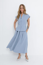 Комплект женский двухпредметный. Блуза свободного покроя. Вырез горловины асимметричной формы с воланом и декоративной патой в области плеча. Рукав один отрезной на базе цельнокроеного. В боковых швах разрезы. Брюки прямые, в боковых швах функциональные карманы. Пояс отрезной с эластичной тесьмой.