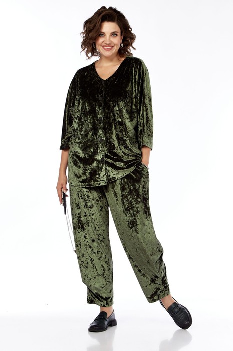 Комплект брючный (кардиган+брюки). Кардиган с цельнокроенным рукавом, с центральной застежкой на петли и пуговицы. Горловина V-образная. Брюки зауженные к низу (на передней половинке по низу застрочена складка). В боковых швах обработанные карманы. Верхний срез обработан поясом с резинкой и шнуром.