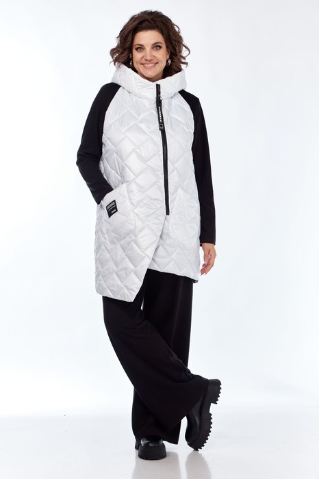 Комплект брючный (тройка). Кофта прямого силуэта, по боковым швам разрезы, пройма квадратная, рукав втачной одношовный, стойка цельнокроенная. Брюки широкие, верхний срез обработан поясом с резинкой. Жилетка расширенная к низу, со смещенной застежкой на тесьму-молнию, ассиметричный низ. Накладные карманы, широкая пройма. Капюшон с отделочной деталью по отлету. В качестве отделки используется фурнитура.