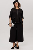 Комплект брючный состоит из брюк, топа и кардигана-кимано. Брюки прямые, широкие с боковыми карманами и поясом на резинке. Топ из отделочной ткани на регулирующихся бретелях с вытачками по переду. Кардиган-кимано длиной до линии бедра, запахивается и завязывается съемным поясом. Рукав втачной одношовный со спущенной линией плеча. По переду шировкая планка.