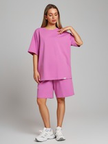 Комплект женский состоит из юбки и рубашки. Рубашка свободного кроя с центральной застежкой на петли-пуговицы. Спущенное плечо, втачной одношовный рукав (фиксируется отворот на петлю и пуговицу) по переду прорезные карманы с листочкой. Воротник-стойка. Юбка длинная, верхний срез обработан поясом на резинке с застежкой на петлю и пуговицу в левом боковом шве с потайной тесьмой-молнией. Юбка кроенная по косой. На заднем полотнище талиевые вытачки.