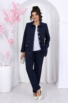 Комплект женский состоит из жакета и брюк. Жакет свободного кроя с застежкой на 2 петли и пуговицы. Перед с боковыми карманами "с листочкой". Рукав втачной, 2-шовный со спущенной линией плеча, спинка по низу частично на резинке. Воротник отложной с лацканами. Жакет без подкладки.Брюки широкие. Передние половинки брюк со складками внахлест, с боковыми карманами. Застежка спереди на молнию, передние половинки брюк с вытачками. Пояс по спинке на резинке.