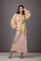 Жакет полуприлегающего силуэта, длинной ниже линии бедер.  Спинка с таллиевыми вытачками и средним швом.  Перед с нагрудными вытачками, переведенными в линии плечевого шва и накладными карманами. Жакет с центрально-бортовой застежкой на одну петлю-пуговицу и воротником пиджачного типа. Жакет на подкладке. Рукава втачные, двух-шовные, стандартной длины.