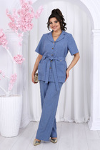 Брюки прямые, на притачном поясе с резинкой. Задние и передние половинки брюк с таллиевыми вытачками. По передним половинкам брюк обработаны накладные карманы, переходящие на задние половинки брюк.