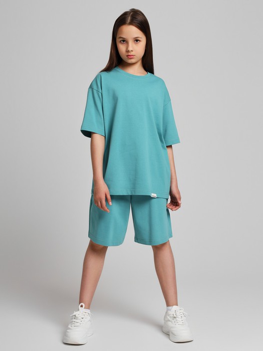 Костюм для девочки из плотного гладкокрашеного трикотажного полотна "кулирка", состоящий из футболки и шорт. Футболка - свободного покроя, с удлиненными плечевым и швами, короткими втачными рукавами и горловиной овальной формы, обработанной втачной планкой. В нижней части переда слева настрочен декоративный элемент прямоугольной формы. По горловине проложена отделочная строчка. Шорты - классического покроя, на притачном поясе с эластичной тесьмой внутри и карманами в боковых швах. Для регулирования степени прилегания шорт по талии в пояс вставлен шнурок, продетый через два отверстия в соединительных швах в центре пояса.