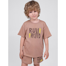 Костюм для девочки, состоящий из джемпера и и шорт. Джемпер - из гладкокрашеного полотна, с принтом в центре переда, свободного покроя, укороченный, с длинными втачными рукавами и горловиной овальной формы, обработанной втачной планкой. По шву втачивания планки настрочена отделочная строчка. Шорты - из полотна с набивным рисунком, средней длины, на притачном поясе с эластичной тесьмой внутри. Средний шов переда выполнен с имитацией застежки "гульфик" с тремя декоративными пуговицами.