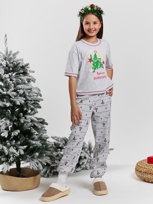 Костюм для девочки из трикотажного полотна в комбинации двух видов: полотна "кулирка-кармеланж" и полотна "кулирка"с набивным тематическим рисунком , состоящий из футболки и брюк. Футболка - модного силуэта, слегка укороченная свободного покроя, с приспущенным плечом, с втачными рукавами длиной до локтя, горловиной овальной формы, обработанной втачной планкой и принтом в центре переда. По шву втачивани я планки настрочена декоративная (5-ниточная) отделочная строчка нитками контрастного цвета Подгибка низа рукавов и изделия так же выполнена с применением декоративной отделочной строчки. Брюки выполнены из полотна с набивным тематическим рисунком, длинные, умеренной ширины, прямые, с эластичной тесьмой по талии.