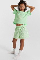 Эффектный костюм для девочки из хлопкового полотна с лайкрой. Футболка с принтом в модной стилистике, свободная, со спущенной линией плеч, округлым вырезом горловины, короткими рукавами. Шорты-юбка с боковыми карманами, на притачном поясе с отстроченной эластичной тесьмой.