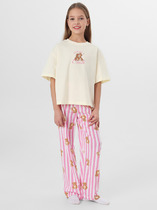 Костюм для мальчика из трикотажного полотна "кулирка" в комбинации двух видов , состоящий из футболки и брюк. Футболка - из гладкокрашеного полотна, свободного покроя, со спущенным плечом, короткими втачными рукавами, горловиной овальной формы, обработанной втачной планкой, и принтом в центре переда. По шву втачивания планки настрочена двойная отделочная строчка. Брюки - из полотна с набивным рисунком, на притачном поясе с эластичной тесьмой внутри, с карманами в боковых швах. Входы в карманы окантованы основным материалом.