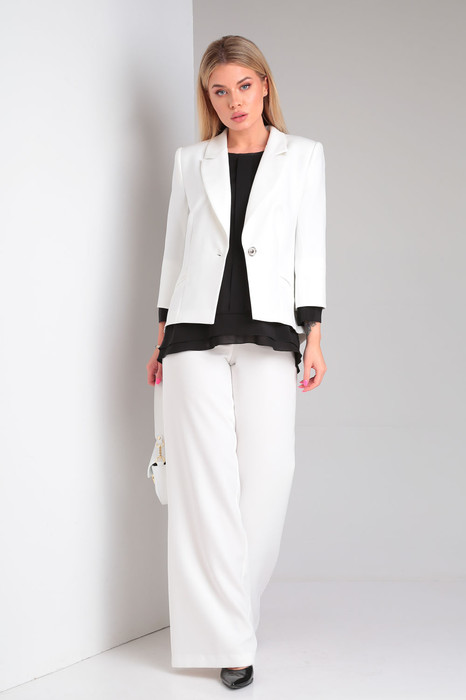 Элегантный брючный костюм в комплекте с шифоновой блузкой.Жакет полуприлегающего силуэта с воротником и лацканами классической формы, застежкой на 1 пуговицу. Особое внимание заслуживает экстравагантная спинка с имитацией запаха и серебристыми металлическими акцентами в виде  цепочек, соединяющих две половинки отлетной спинки.Брюки прямого покроя расширены от линии бедра. Комфортная посадка брюк и подчеркивающий фигуру крой сделает их любимым предметом вашего гардероба.Костюм выполнен из материала модных цветов, не требующего особого ухода, пластичен и удобен в носке.Блузка-туника нежного молочного пастельного оттенка с шифоновыми рукавами. Блуза очаровывает своим красивым непринужденным полуприлегающим силуэтом, фигурной линией низа, и конечно же спинкой.Фантазийная спинка с шифоновыми вставками и воланами, красиво драпирующимися и являющимися одним из популярных трендов, шикарно смотрится как самостоятельно, так и в сочетании с эффектным разрезом на жакете.