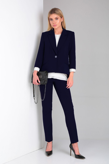 Элегантный брючный костюм в комплекте с шифоновой блузкой.Жакет полуприлегающего силуэта с воротником и лацканами классической формы, застежкой на 1 пуговицу. Особое внимание заслуживает экстравагантная спинка с имитацией запаха и серебристыми металлическими акцентами в виде  цепочек, соединяющих две половинки отлетной спинки.Брюки заужены к низу, на поясе со шлевками, которые никогда не выйдут из моды, подчеркнут вашу женственность и добавят дополнительную длину к вашим ногам. Застежка молния спереди. В боковых швах  размезы длиной 3 см. Комфортная посадка брюк и подчеркивающий фигуру крой сделает их любимым предметом вашего гардероба. Блузка-туника нежного молочного пастельного оттенка с шифоновыми рукавами. Блуза очаровывает своим красивым непринужденным полуприлегающим силуэтом, фигурной линией низа, и конечно же спинкой.Фантазийная спинка с шифоновыми вставками и воланами, красиво драпирующимися и являющимися одним из популярных трендов, шикарно смотрится как самостоятельно, так и в сочетании с эффектным разрезом на жакете.