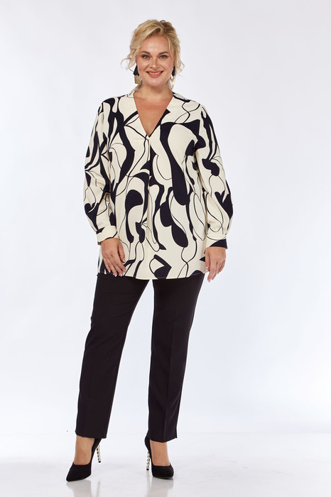 Блуза свободного силуэта, выполнена из легкой струящейся ткани с модным принтом. По переду заложена складка для свободы движения. На спинке горизонтальный подрез с встречной складкой. По боковым швам у блузы разрезы. Рукав втачной одношовный с манжетой. Застегивается рукав на 2 петли и пуговицы.