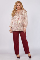Комплект 2-х предметный, состоит из блузы и брюк. Блуза прямого силуэта, выполнена из ткани стойкой к сминанию. На полочке нагрудные вытачки, средний шов. По среднему шву фальш-застежка на навесные петли и пуговицы. Вырез горловины V-образный декорирован шнуровкой из основной ткани. Рукав втачной, полной длины, декоративным элеменом является крылышко, что придает романтичный стиль образу. Низ рукава присборен, обработан манжетой. По низу изделия в боковых швах разрезы. Брюки с заутюженными стрелками слегка зауженные к низу, полной длины. Пояс притачной, частично на резинке. Застежка на тесьму-молнию и пуговицу.