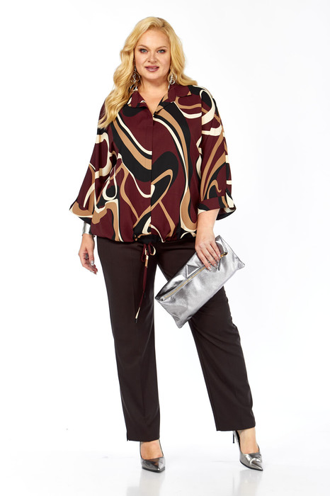 Стильный образ подчеркнет привлекательность, комплект двух предметный, состоит из блузы и брюк. Блузка прямого силуэта из принтованной ткани с красивым цветовым акцентом. Вырез горловины V-образной формы, воротник классический рубашечный на отложной стойке. По центру полочки выполнена планка. Модель с цельнокроеным рукавом, низ оформлен с застежкой на пату, образ выглядит стильно. Низ блузы на кулиске, используется для равномерной сборки изделия. Брюки классические с заутюженными стрелками, слегка зауженные к низу, оформлены притачным поясом, частично на резинке. Застежка спереди брюк на молнию и петлю-пуговицу