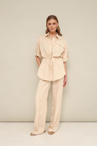 Комплект женский, состоящий из куртки и юбки. Куртка о-образного силуэта на подкладке. Застежка на молнии. Спинка с декоративной кокеткой, придающей конструкции более изящный силуэт. Передняя часть с рельефом и карманом с листочкой. Воротник стойка, линия плеча спущенная. Рукав втачной со средним швом. Низ куртки со сборкой, добавляющая стильный акцент. В юбке силуэт прямой, зауженный к низу, подчеркивающий фигуру. Переднее и заднее полотнище с подрезами и вытачками. Заднее полотнище со средним швом, шлицей и патайной молнией. Переднее полотнище со средним швом, обеспечивает симметричный внешний вид. Верх юбки обработан обтачкой. Универсальный дизайн сочетается с различными предметами гардероба.