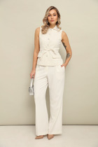 Комплект: блузка+брюки. Комплект выполнен из трикотажного полотна в пайетки. Блузка прямого силуэта, длиной ниже линии бедер. Перед и спинка цельные. Спереди застежка на пуговицы. Стояче-отложной воротник с отрезной стойкой. Плечевой шов удлинен. Рукав рубашечного покроя, одношовный, длиной ниже линии локтя. Низ рукава декорирован тесьмой-кружевом. В комплект входит съемный галстук. Галстук и воротник выполнены из атласа. Низ блузки фигурной формы. Блузка на отлетной по низу подкладке.  Брюки прямого силуэта, длиной до линии щиколотки, на притачном поясе с эластичной тесьмой. В боковых швах карманы. Брюки на отлетной по низу подкладке.