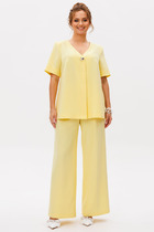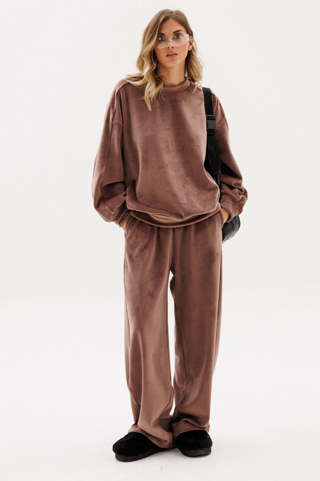 Комплект: джемпер+брюки. Комплект выполнен из двустороннего велюра в мелкий рубчик. Джемпер О-образного силуэта, покроя "oversize", длиной до линии бедер. Перед и спинка цельные. Горловина округлой формы, обработана бейкой. Плечевой шов удлинен. Рукав рубашечного покроя, одношовный. Низ рукава на манжете. Верхняя часть рукава переходит в кокетку переда т спинки и доходит до горловины. По низу джемпера обработан пояс. Пояс, манжеты, верхняя часть рукава и бейка горловины выполнены из основной, но без рубчика. Брюки на притачном поясе с эластичной тесьмой, прямого силуэта, длиной в пол, покроя "oversize". Боковой шов заменен лампасом. В швах лампаса карманы. Сзади накладные карманы. В пояс протянут шнур с наконечниками. По низу брюк втянута эластичная тесьма с фиксаторами. Лампасы и пояс выполнены из основной ткани, но без рубчика.