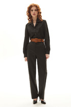 Комплект: джемпер+брюки. Комплект выполнен из двустороннего велюра в мелкий рубчик. Джемпер О-образного силуэта, покроя "oversize", длиной до линии бедер. Перед и спинка цельные. Горловина округлой формы, обработана бейкой. Плечевой шов удлинен. Рукав рубашечного покроя, одношовный. Низ рукава на манжете. Верхняя часть рукава переходит в кокетку переда т спинки и доходит до горловины. По низу джемпера обработан пояс. Пояс, манжеты, верхняя часть рукава и бейка горловины выполнены из основной, но без рубчика. Брюки на притачном поясе с эластичной тесьмой, прямого силуэта, длиной в пол, покроя "oversize". Боковой шов заменен лампасом. В швах лампаса карманы. Сзади накладные карманы. В пояс протянут шнур с наконечниками. По низу брюк втянута эластичная тесьма с фиксаторами. Лампасы и пояс выполнены из основной ткани, но без рубчика.