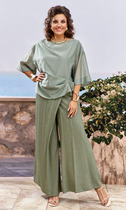 Костюм женский 2х предметный состоит из жакета и брюк. Жакет прилегающего кроя, по полочке жакета расположены прорезные карманы с клапанами. Горловина - отложной воротник с лацканами. Рукав втачной длинный.  Застежка петля-пуговица. Брюки прямого кроя с высокой посадкой, на притачном поясе со вставками эластичной тесьмы.  в боковых швах брюк -палаццо имеются карманы. Застежка  молния на гульфике, петля-пуговица. Жакет без подкладки.