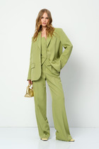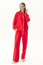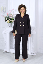 Костюм женский 2х предметный  состоит из топа и брюк, выполнен из сочетания легкой струящейся ткани и сетки. Топ свободного кроя, ассиметричный , по полочке расположены нагрудные выточки, брюки на притачном поясе с резинкой, по передним полотнищам брюк расположены вставки из полупрозрачной сетки.
