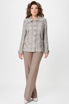 Костюм женский состоит из жилета и брюк. Жилет выполнен в классическом стиле приталенного кроя, по полочке жилета расположены таллиевые и нагрудные выточки, на груди расположены накладные карманы с клапаном. Горловина обработана плосколежащим воротником. По полочке изделия так же расположена планка с застежкой петли-пуговицы. Брюки костюм классического кроя на притачном поясе с резинкой в боковых швах. В боковых швах расположены карманы. застежка молния на гульфике и петля- пуговица.
