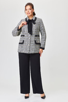 Костюм женский двухпредметный состоит из жакета и брюк. Жакет двубортный с отложным воротником и лацканами (английский воротник). По полочке жакета расположены рельефа с нагрудной выточкой и карманы. Рукав втачной длинный. Спинка жакета распашная, с фиксацией по плечам, в области талии на спинке декоративная перетяжка. Брюки прямого кроя с небольшим расклешением. брюки без пояса с обтачкой, застежка брюк молния.